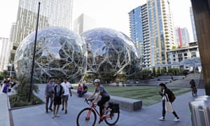 Pedestrians and cyclists gather near the Bezos balls in Seattle. The conservatories are modelled on the greenhouses at London’s Kew Gardens.